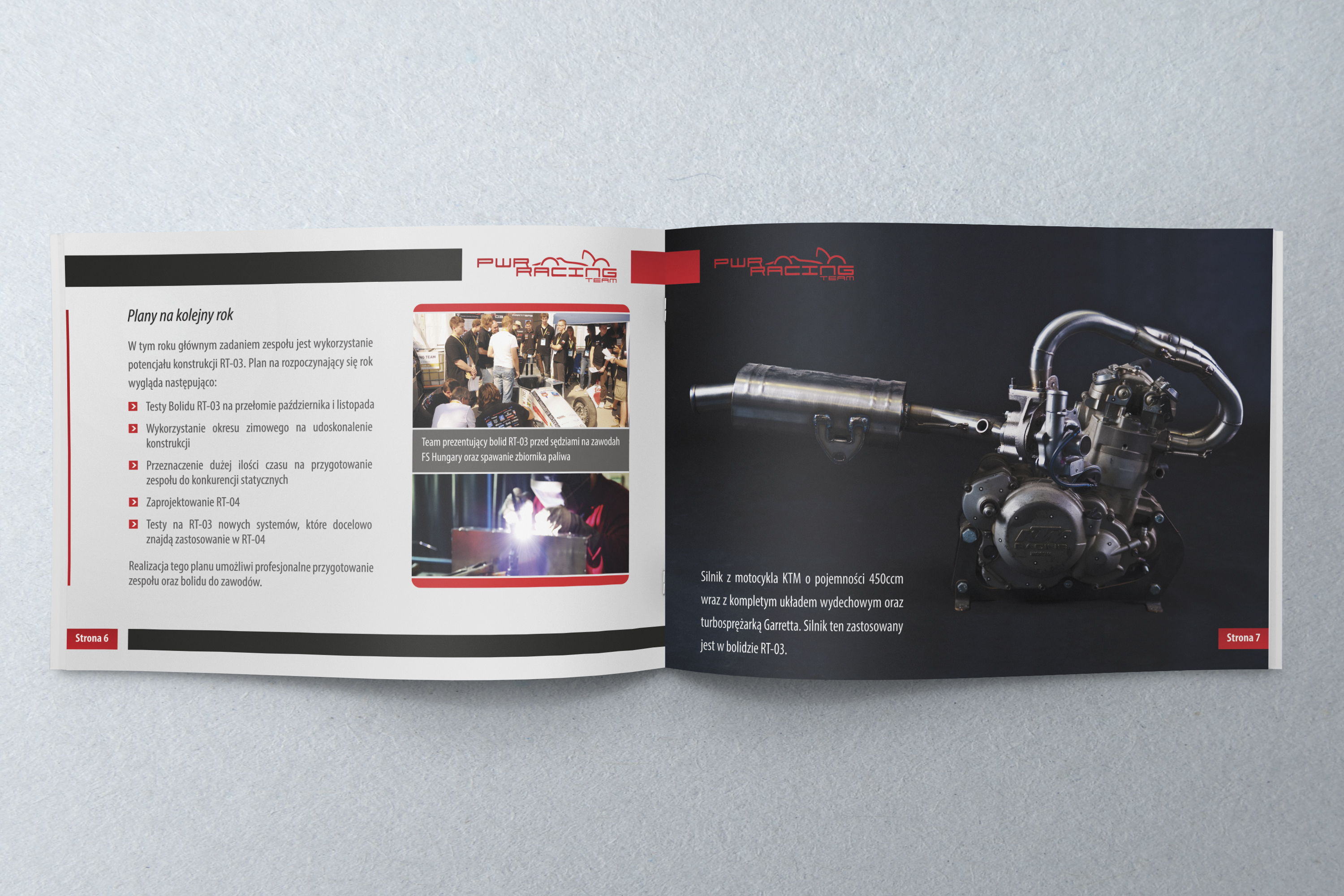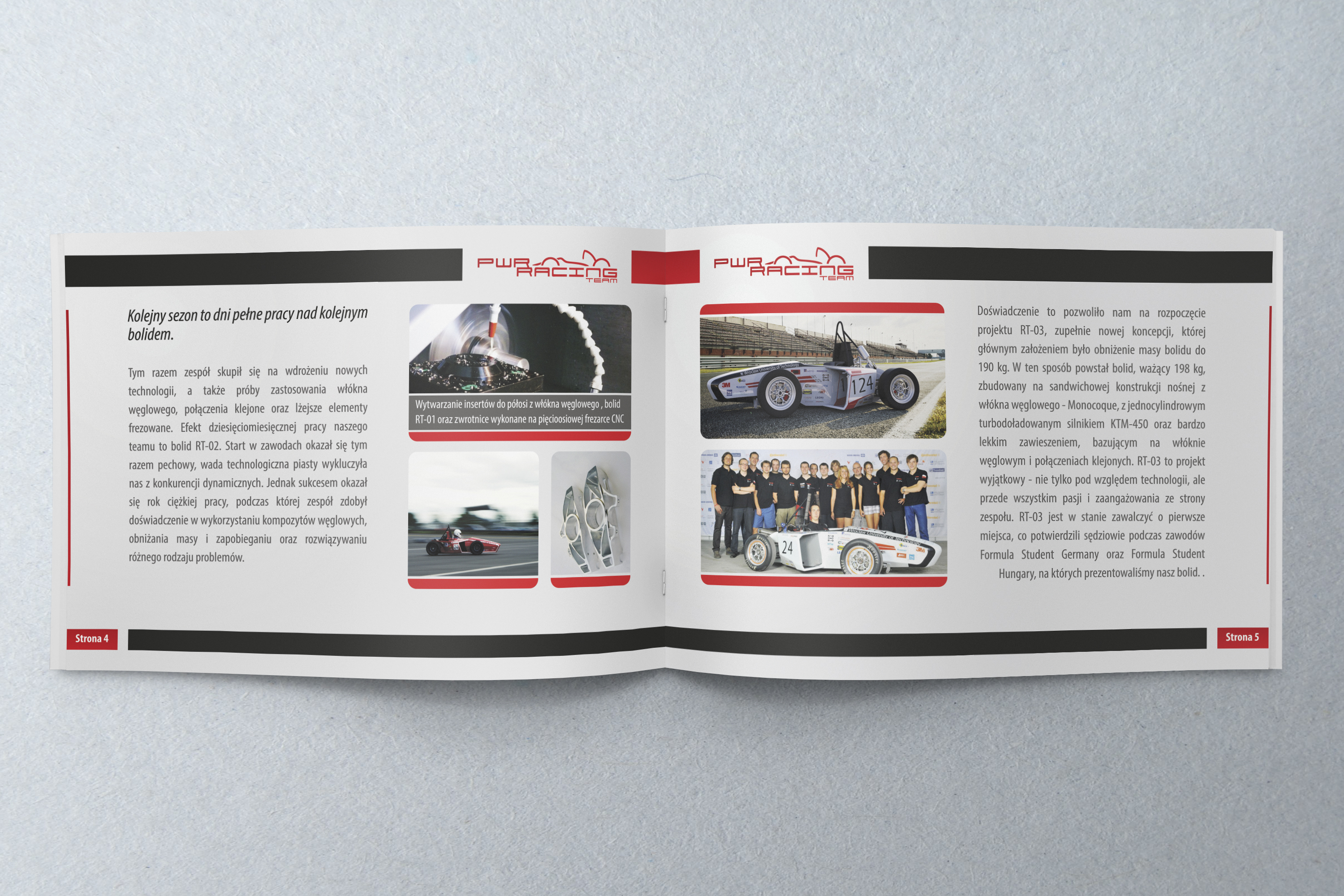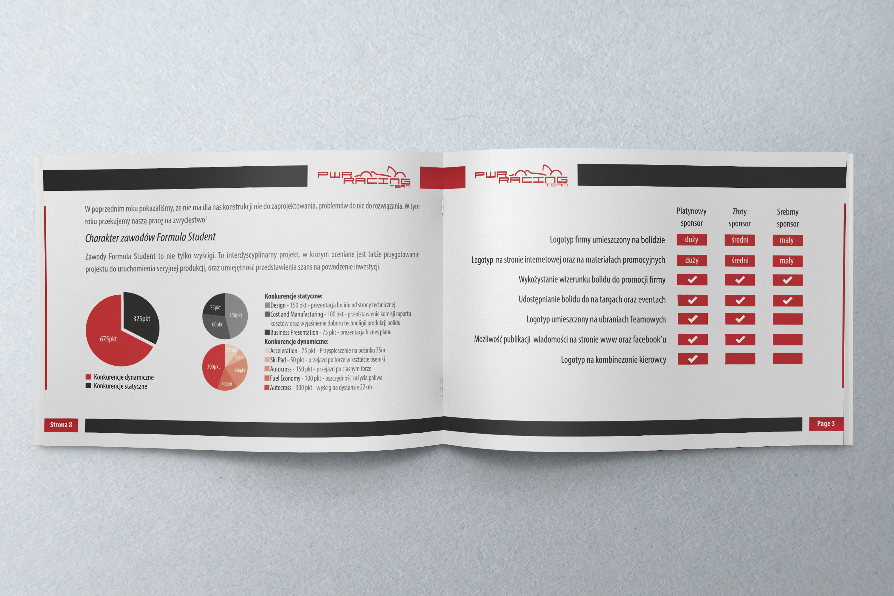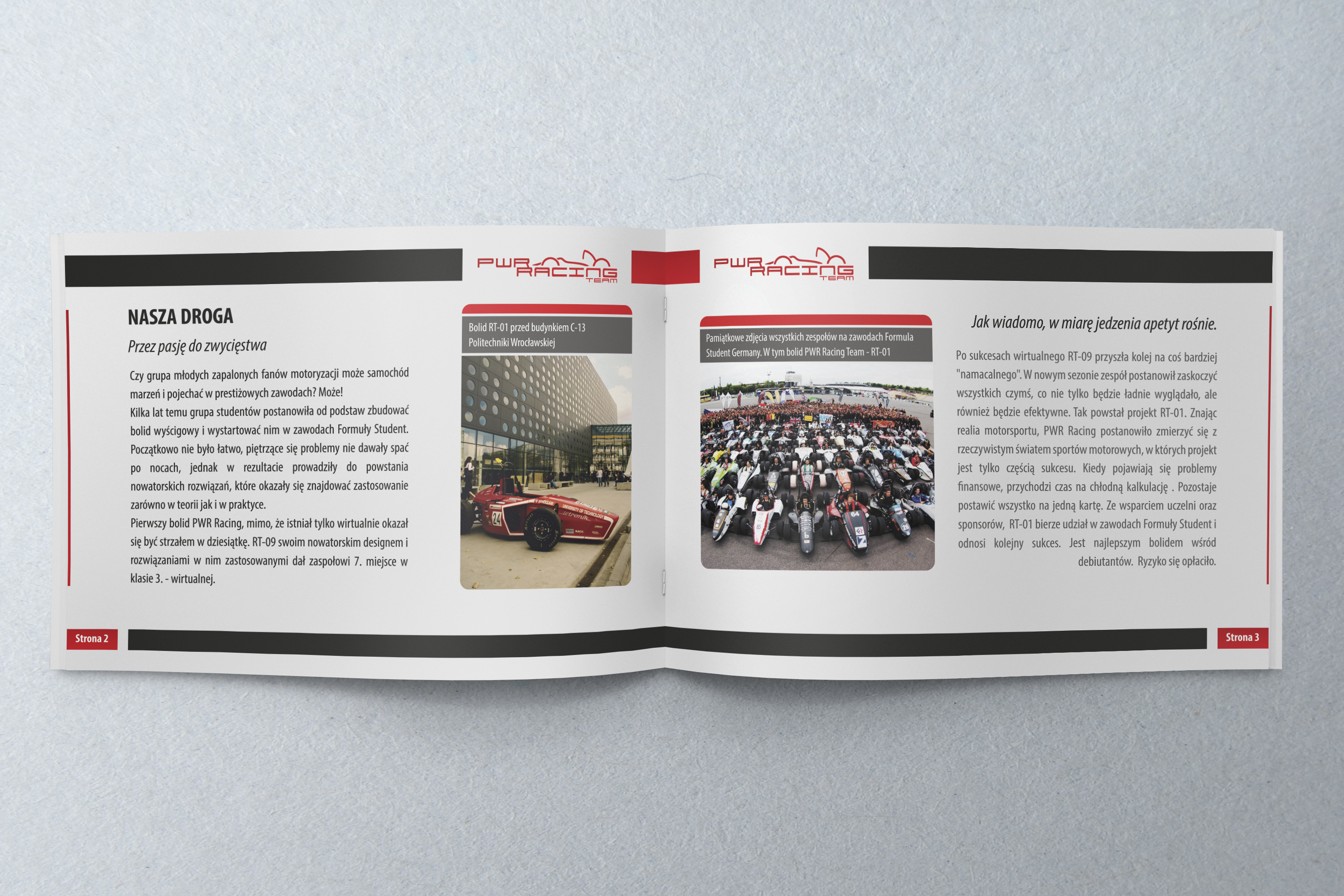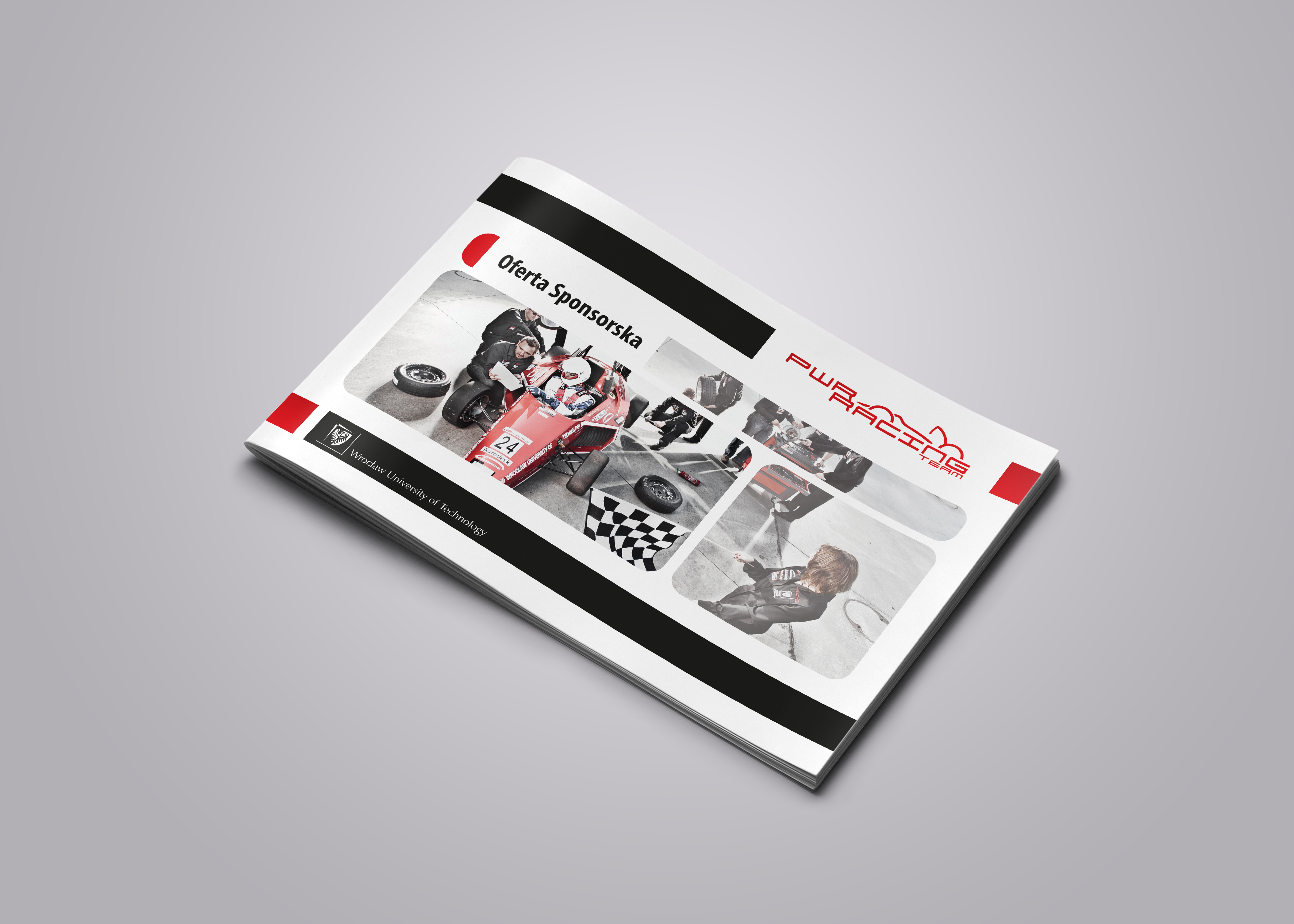 Projekt graficzny, przygotowanie do druku i druk broszu reklamowych dla PWR Racing Team.