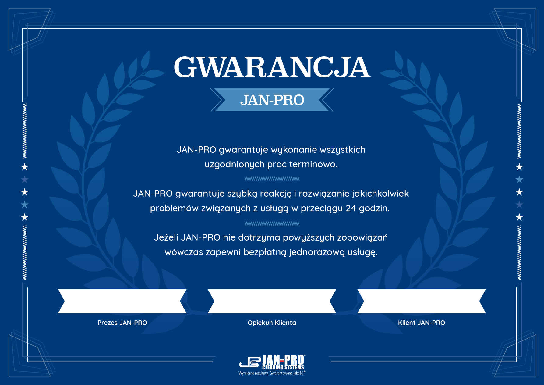 Każdy klient, który podejmuje współpracę z firmą JAN-PRO otrzymuje gwarancję jakości – zobowiązanie firmy do przestrzegania unikalnych procesów.